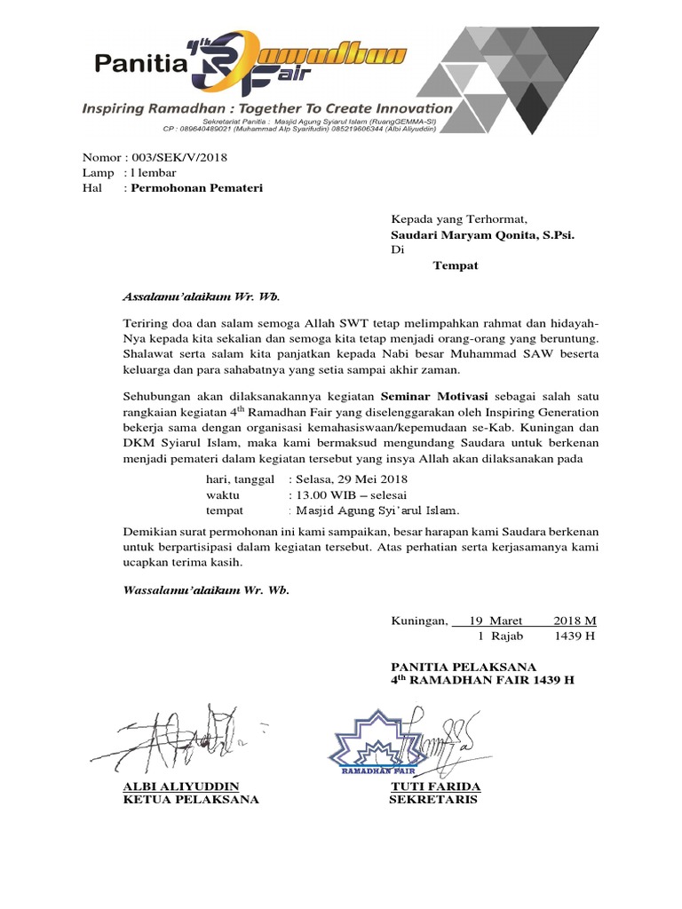 Contoh surat permohonan menjadi pemateri seminar pelatihan acara kegiatan himpunan mahasiswa berikut ini adalah contoh tentang.