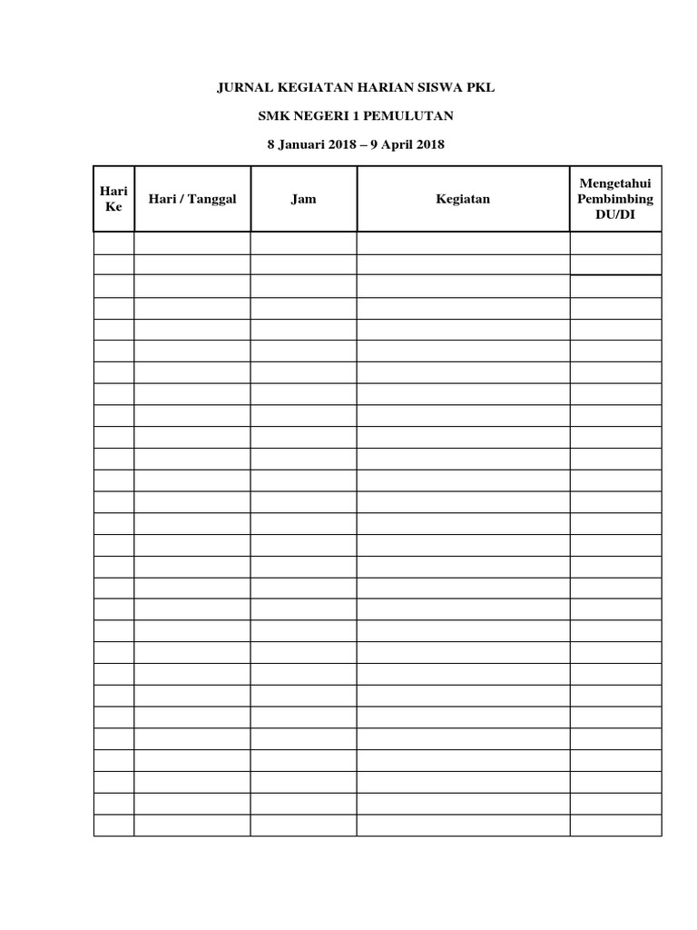 Jurnal ilmiah contoh jurnal internasional contoh jurnal nasional contoh jurnal harian skp contoh jurnal umum contoh jurnal las contoh jurnal. Download kumpulan contoh lengkap mengenai contoh jurnal harian siswa secara gratis disini termasuk contoh surat penawaran harga diskon, contoh surat penawaran laptop, contoh surat penawaran barang yang salah, dan masih banyak contoh lain yang berkaitan dengan contoh jurnal. Contoh jurnal harian siswa ini dapat diterapkan pada pembelajaran di sd, smp, sma yang sekaligus saya sediakan format jurnal untuk digunakan siswa. Contoh laporan harian proyekfull description. Contoh jurnal siswa dan guru sd seputaran pembelajaran ipa di cara mengajarku mengajar kelas 5. Contoh buku catatan harian siswa. Penulis akan menyajikan beberapa tahapan membuat beserta contoh jurnal untuk memudakan memahami. No hari/ tanggal uraaian pekerjaan harian mulai pukul selesai pukul paraf pembibing ket 1 2 3 4 5 6 7. Buku jurnal siswa laporan kegiatan prakerin di dunia usaha/industri sekolah menengah kejuruan muhammadiyah 2 kalirejo lampung tengah 2015 nama siswa jurnal kegiatan harian by riefky semy 24194 views. Pada kolom keterangan dapat diisi sesuai dengan kondisi yang sebenarnya. Assalamu'alaikum, sahabat kusnadi yang budiman! Gambar 1, contoh format absensi siswa atau daftar hadir siswa beriigan dengan jurnal harian kelas (gambar 2). Untuk kali ini kami akan bagikan contoh jurnal harian guru dan siswa format excel untuk k.